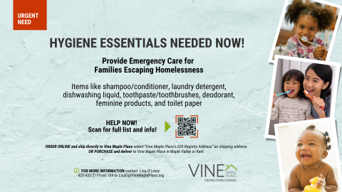 - Plan a Hygiene Drive. Plan a drive to collect Hygiene Essentials or consider a standing drive – regular donations are so important to our families. Call or email Lisa O’Leary to let her know. Lisao@vinemapleplace.org | 425-432-2119 x104